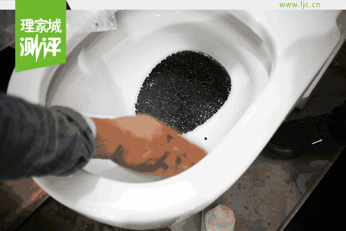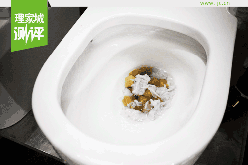 現(xiàn)場小編用玻璃屑、100個(gè)聚丙烯球一個(gè)管道球、海綿紙巾模擬各種排泄物進(jìn)行了沖水試驗(yàn),在漩轉(zhuǎn)瀑布水流、優(yōu)良陶瓷管道的配合下,噴射式水流瞬間將玻璃屑、高爾浮球、海綿紙巾等堵塞物吸走,沖力十足。