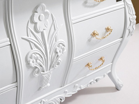 MFG-24實木仿古柜,采用泰國進口橡木,配以水晶木紋白天然大理石臺面,以及圓弧形立體大理石臺下盆。純白色彩配以金色五金拉手,整體外觀凸現(xiàn)新一代田園風格,產(chǎn)品游走于現(xiàn)代與復古之間,線條簡約而不簡單,品味低調(diào)而不失奢華。